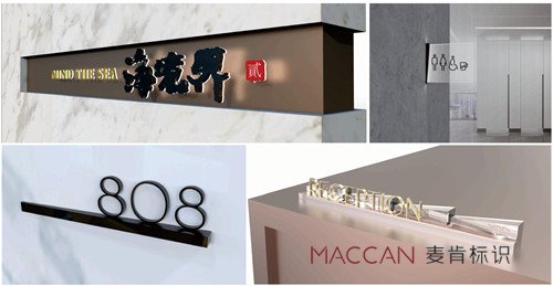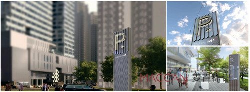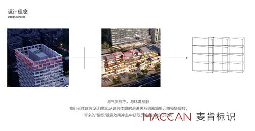 設計師通過簡練的線條和充滿創(chuàng)意的結(jié)構(gòu)創(chuàng)造,將建筑及景觀、空間的語言轉(zhuǎn)化到標識系統(tǒng);用提煉的元素重疊旋轉(zhuǎn)及錯位關(guān)系反映在標識牌上與氣質(zhì)相符, 與環(huán)境相融;麥肯延續(xù)海境界建筑設計理念,從建筑體量的退進關(guān)系到幕墻單元格模塊旋轉(zhuǎn),帶來的"編織"視覺效果沖擊中獲取靈感,提煉核心元素,使其環(huán)境標識牌與建筑遙相呼應,賦予來訪者一個關(guān)于頂級人居生活場所的絕佳審美期待 。