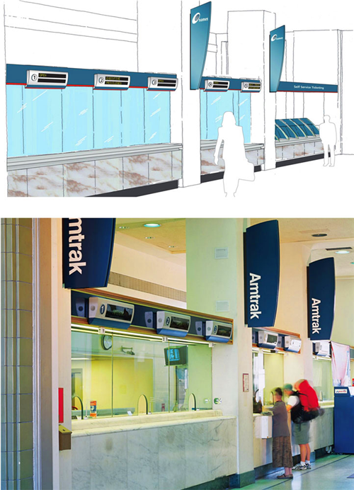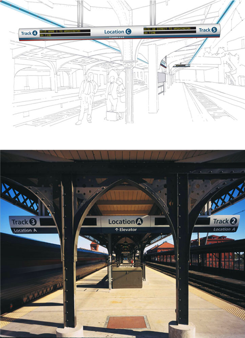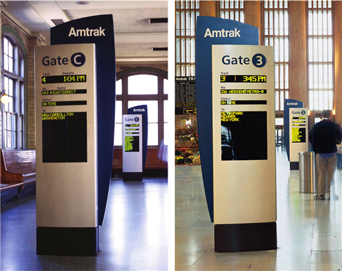 C&VE工作室為阿西樂(lè)車(chē)站設(shè)計(jì)了一套導(dǎo)視系統(tǒng),將該導(dǎo)視系統(tǒng)作為Amtrak的高速運(yùn)營(yíng)服務(wù)品牌,并打造了一個(gè)具有凸顯品牌特色的形象。通過(guò)對(duì)旅客在使用Amtrak服務(wù)之后的調(diào)查表明,從站外買(mǎi)票,進(jìn)入大廳,再到月臺(tái)的整個(gè)過(guò)程,這套導(dǎo)視系統(tǒng)都發(fā)揮了其應(yīng)有的作用。