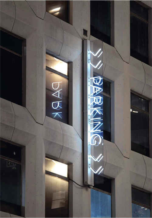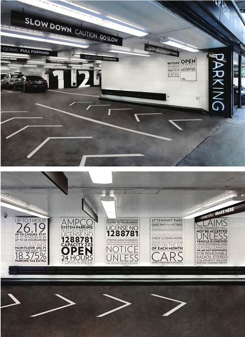 Scher以車輛后座的視覺角度來設(shè)計(jì)最佳的視覺效果,采用了大型字體的設(shè)計(jì)將信息傳達(dá)給大眾,同時(shí)也在一定程度上保證了駕駛者不會(huì)忘記自己把車停在哪里了。警示語的設(shè)計(jì)在一定程度上同樣吸引駕駛者的注意,目的是讓他們意識(shí)到駕駛的安全問題,如“寧讓三分,莫爭(zhēng)一秒”和“請(qǐng)不要停在這里”等,在車場(chǎng)門口,你還看到那醒目的霓虹燈標(biāo)識(shí)。