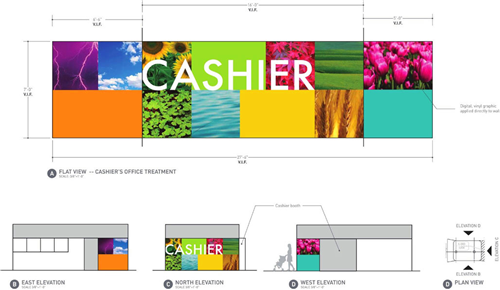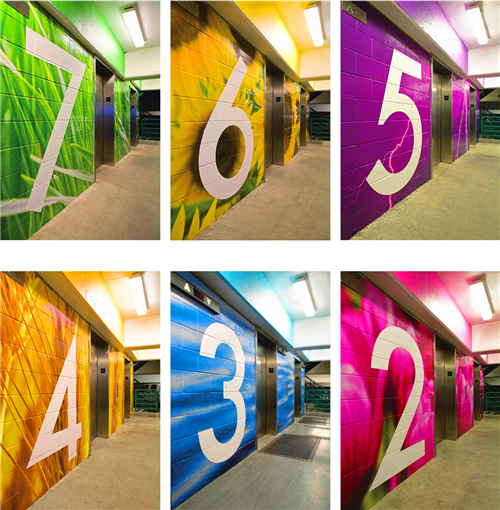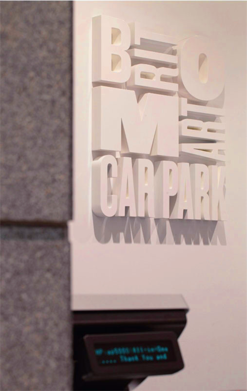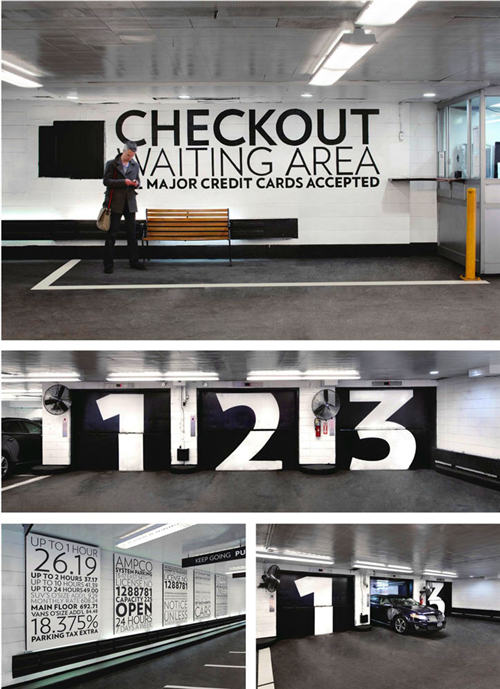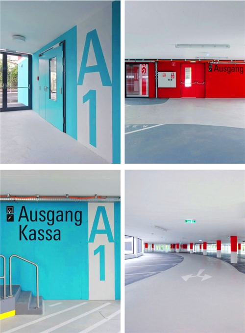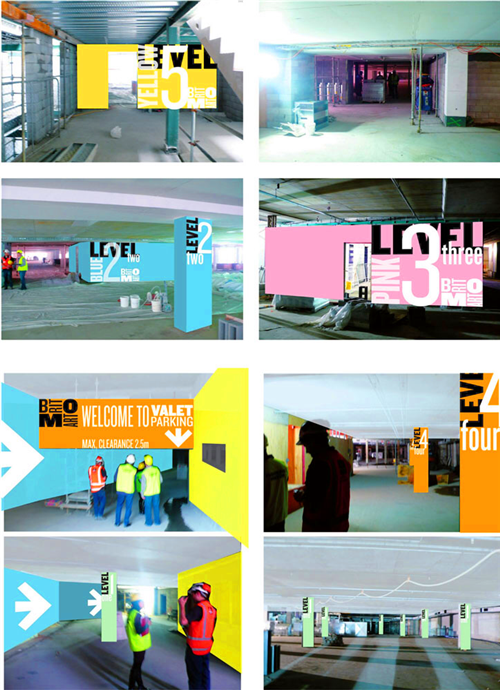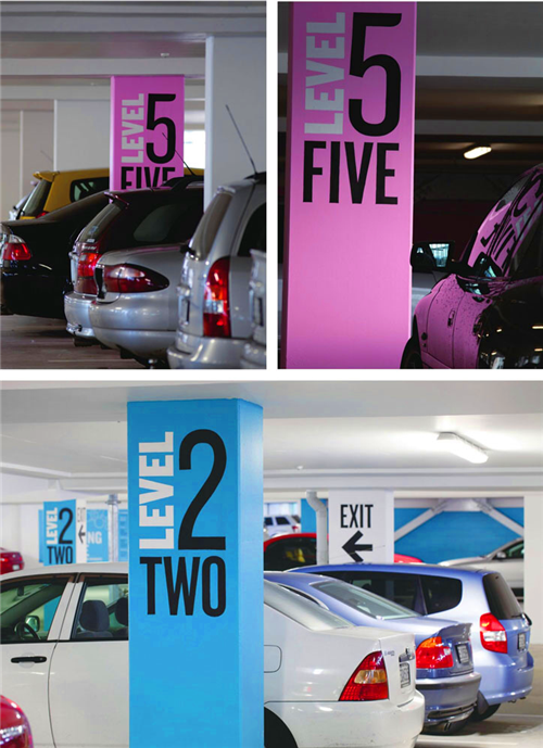 當(dāng)你駕車到一個(gè)7層高的停車場(chǎng),在尋找??课恢脮r(shí)一定會(huì)令人摸不著頭腦。車場(chǎng)的字體設(shè)計(jì)由專門的手寫字體設(shè)計(jì)師直接寫在停車場(chǎng)的墻上。不同顏色的墻體是停車場(chǎng)用來提示駕駛者樓層信息的設(shè)計(jì)手段。