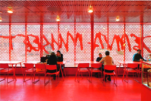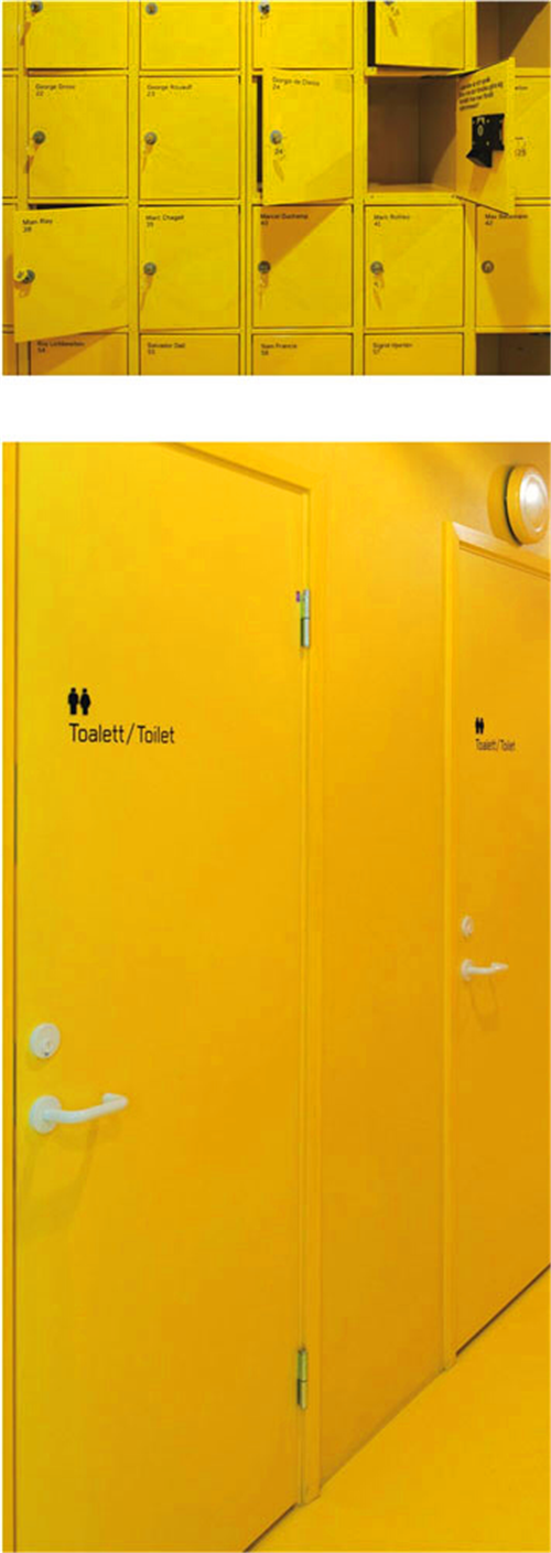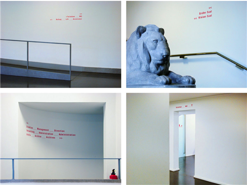標識和指示牌的設計以德語、英語和法語等語言組列成一條直線。指示信息就貼在墻身上,依靠自然光和紅色的字體設計來作為該博物館的特色。