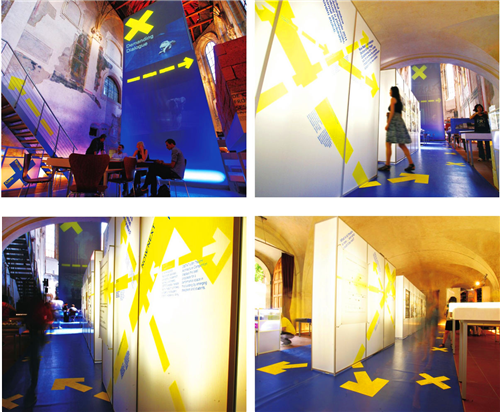 黃色十字設計的圖案遍布在會場的各個角落,黃藍雙色的設計、溫暖而寧靜的氣氛與建筑物內(nèi)部的歷史氛圍相互映襯,咨詢臺、書桌和咖啡廳等都采用了柔和的黃色和藍色搭配。虛線的設計與導視系統(tǒng)相結合,會場設置了一些大型的燈箱,流動的虛線十字設計在宣傳設計展覽信息的同時,也是一個導視系統(tǒng)的設計。