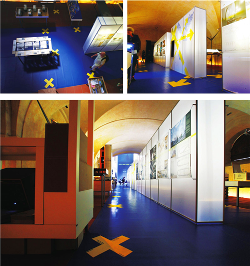 2011年“布拉格劇場設計四年展”的環(huán)境標識設計結合了展廳的布置,營造出一種具有傳統(tǒng)建筑風格的特點,利用了黃色的十字線設計來作為導視系統(tǒng)來引導觀眾,十字形里面有著不同的語言,代表著不同地區(qū)文化和藝術形式。