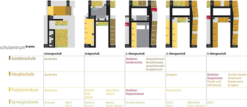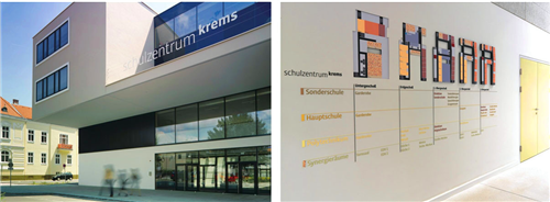 從標識的設計到學校中心的設計,從上到下都是為了營造一個充滿視覺沖擊力的空間。標識突出了整個設計理念,從教學樓整體的建筑結構就可以知道教室的具體位置,Bohatsch und Partner設計工作室用立方體標識牌的設計來表示不同教室的功能,采用樹脂玻璃作為可拆除的標識牌,目的就是為了將教室的功能在必要時可以進行轉換。