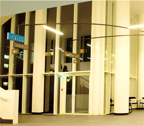 導(dǎo)視系統(tǒng)的視覺設(shè)計(jì)反映了這兩個(gè)功能區(qū)域的特色,而且建筑物的瓷磚就是一個(gè)很好的例子,一邊是米黃色,一邊是白色。設(shè)計(jì)師在大堂內(nèi)部設(shè)計(jì)了一個(gè)導(dǎo)視的十字裝置,用以區(qū)分BULAC和INALCO區(qū)域,它告訴游客主要的方向和大樓內(nèi)部的功能區(qū)域。