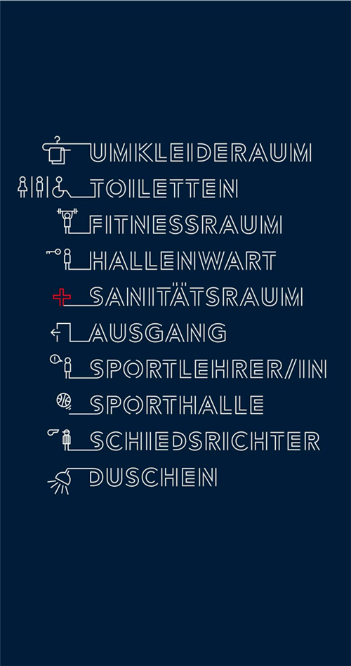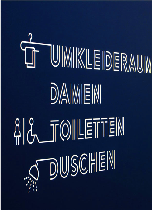 導(dǎo)視系統(tǒng)中最出眾的設(shè)計(jì)就是對字母的改造,將字母做一個(gè)設(shè)計(jì)的斷層,讓這個(gè)空間帶有運(yùn)動(dòng)的干練、直爽感,線條表達(dá)讓字體與圖案相結(jié)合,讓人感覺到運(yùn)動(dòng)的快樂。