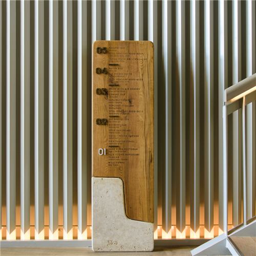 基于酒店名Six Senses,Federation設計機構設計了六個簡約的不規(guī)則圓點logo,象征著六種感覺。精神堡壘為流暢的立體折面,在內部設計了藍色的氛圍燈光,具有神秘感。戶外立式導視板由不規(guī)則木材和石材結合,擁有彎曲的線條,特別的是,在連接處設計了燈光照明,具有裝飾作用。室內采用較厚的圓角方形木材和石材相結合,具有厚重感,配色溫和,打造了優(yōu)雅的酒店環(huán)境。