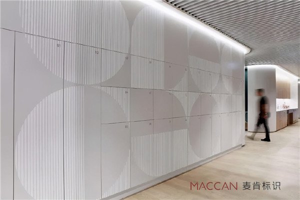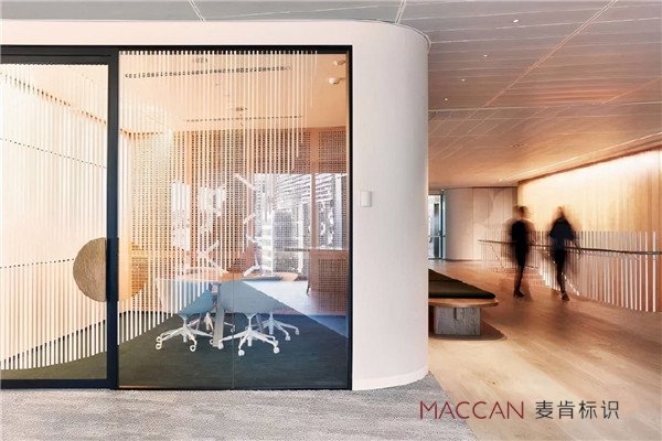 在根據(jù)不同空間的需求進行功能性合理劃分以外,彈性使用的功能空間的設置,對辦公空間來說也是很重要的一部分。由于各種不確定因素的影響,辦公空間標識設計需要從更加人性化的角度入手,比如會議室、接待區(qū)、休息區(qū)、洗手間等空間的設置指示設計,來滿足個體的日常行為需求。