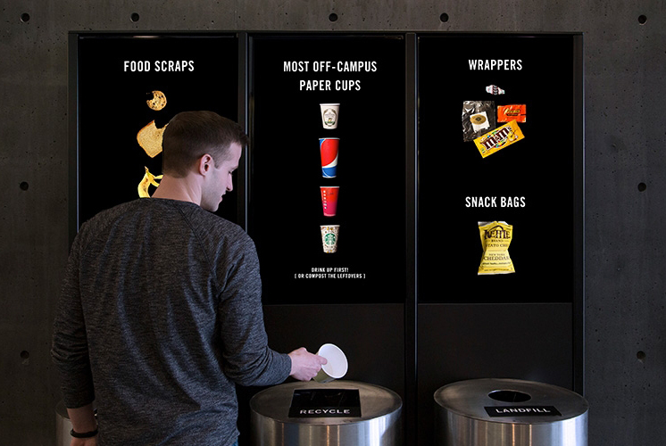 華盛頓大學(xué)“智能垃圾箱”的每個垃圾箱都配有秤、微型計(jì)算機(jī)和數(shù)字屏幕。