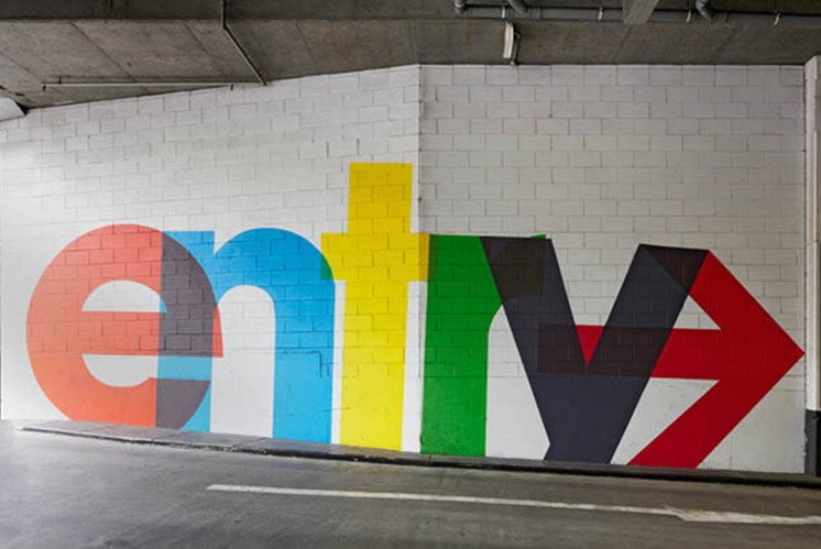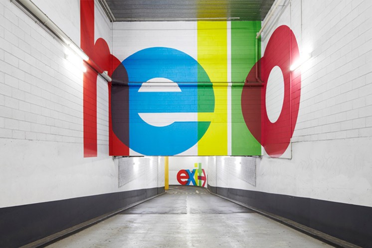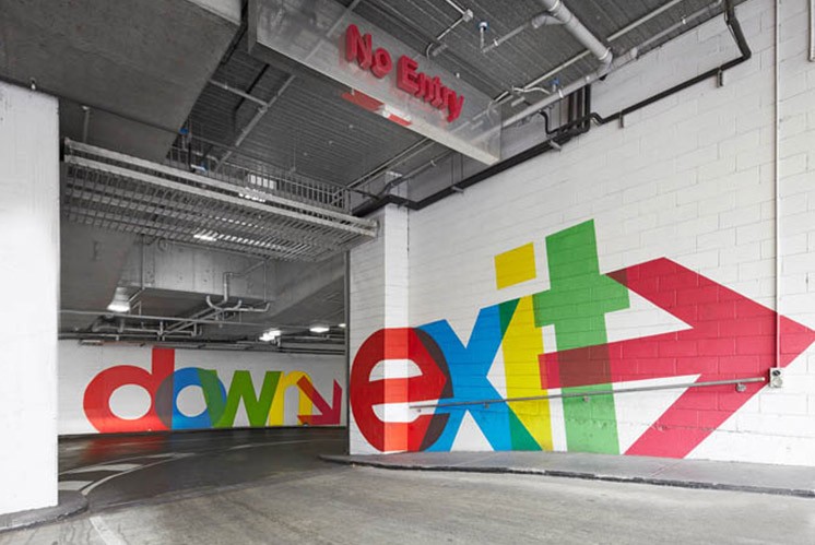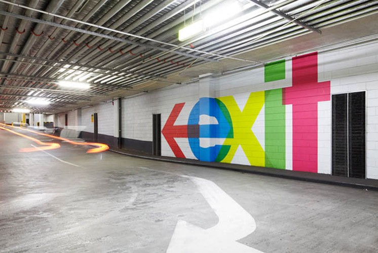 在墨爾本QV商業(yè)地下停車場項目,其標(biāo)識導(dǎo)視系統(tǒng)采用了一系列大規(guī)模的環(huán)境圖形來延續(xù)該商業(yè)項目整體VI形象,且該導(dǎo)視設(shè)計從早期現(xiàn)代主義平面設(shè)計找到靈感,并用既環(huán)保設(shè)計手法噴涂來實現(xiàn)指示功能,文字采用了彩色疊加的方法讓地下停車場相對封閉的空間變得大氣而有藝術(shù)感。