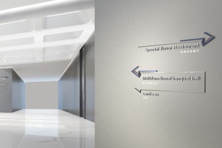 同時(shí),隨處可見(jiàn)的纖細(xì)的立體箭頭指引,被應(yīng)用到公共視覺(jué)系統(tǒng)中,采用透空漏景的結(jié)構(gòu)方式是為了最大限度減弱裝置對(duì)景致的干擾,如線條一般恰到好處地與空間融為一體,既遵循了統(tǒng)一性原則,引入了智慧園區(qū)的理念,又能自然吸引眼球,力求成為建筑物的和諧細(xì)部。