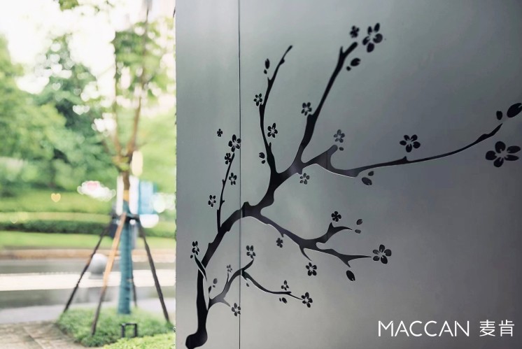 入口處“梅蘭竹菊”四君子導(dǎo)視標(biāo)識在設(shè)計上借用黃公望先生的理念,采用傳統(tǒng)的藝術(shù)創(chuàng)作手法——鏤空雕刻,在光照下的投影有著奇妙的暈光效果,光感柔和且暈光均勻,將自然美、建筑美、人文美有機融合,似山水無言,向往不止,自在由心,步履不停。
