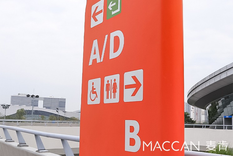 由麥肯標(biāo)識設(shè)計的江門濱江體育中心的標(biāo)識導(dǎo)視,體育館標(biāo)識鮮艷的紅色字樣,進(jìn)入室內(nèi),標(biāo)識牌大膽的橙色沖擊人們的視覺,給予方向鎖定,第一時間便可在空曠的體育館找到目的地地方向。顏色鮮艷的標(biāo)識牌傳達(dá)體育場館活躍、熱烈、激動的視覺氛圍,建筑設(shè)計和標(biāo)識導(dǎo)視設(shè)計無不充分融合,視覺統(tǒng)一,且有主有次。