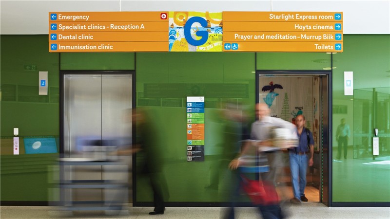 設(shè)計公司與插畫師Jane Reiseger合作為其創(chuàng)建了環(huán)境圖形設(shè)計和導(dǎo)視系統(tǒng)設(shè)計。整個設(shè)計的色彩靈感來自醫(yī)院標(biāo)志本身,基本圍繞標(biāo)志中的黃色、綠色、橘紅色、紅色、天藍(lán)色和深藍(lán)色為主要色調(diào)。設(shè)計師運(yùn)用了輕松的線條和色彩的搭配,繪制了大面積的墻壁插畫,為醫(yī)院增添了樂趣和活力,營造了一種豐富的視覺效果,讓患者、家長甚至是護(hù)士在這里感到放松和愉悅,舒緩了他們的緊張感。導(dǎo)視系統(tǒng)在設(shè)計上與建筑環(huán)境保持了整體的統(tǒng)一性,簡潔表達(dá),與室內(nèi)豐富多彩的裝飾形成鮮明對比,醒目但不突兀。對于如今很多一味追求硬件高大上的建筑來說,這座充滿愛和趣味的兒童醫(yī)院,充滿人性的關(guān)懷,讓建筑回歸服務(wù)人的本質(zhì)。最重要的是豐富的標(biāo)識視覺效果,讓患者、家長甚至是護(hù)士在這里感到放松和愉悅,舒緩了彼此之間的緊張感。