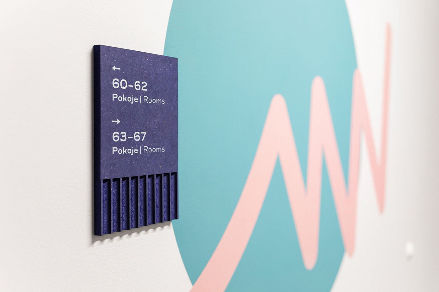 基于宿舍的環(huán)境,Blank工作室設(shè)計了豐富的環(huán)境圖形,圖形的特點是流暢、抽象的線條,增添了趣味性。采用藍色、粉色和棕色的配色,營造了溫馨的環(huán)境,并與空間相得益彰。標牌采用噴漆和中密度板的形式,整套導(dǎo)視系統(tǒng)賦予空間獨特的個性。跳動的粉色和藍色是活力的代表。