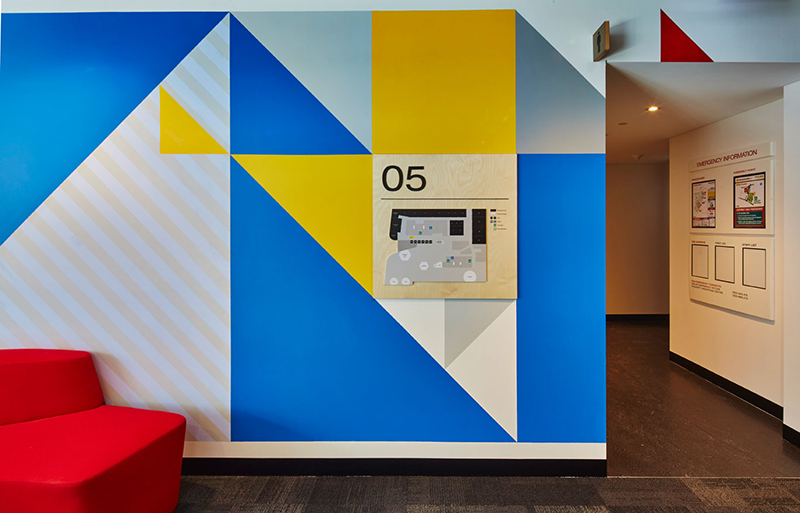 澳大利亞聯(lián)邦銀行位于澳大利亞悉尼, 委托Henry Ellis Paul為其新辦公環(huán)境進(jìn)行導(dǎo)視系統(tǒng)設(shè)計(jì)。 獨(dú)特的圖形設(shè)計(jì)以一組創(chuàng)意色彩組合的形式出現(xiàn),表達(dá)了CBA合作、連接和創(chuàng)新的項(xiàng)目愿景,并為空間注入活力。設(shè)計(jì)師為辦公環(huán)境創(chuàng)建了統(tǒng)一的標(biāo)識系統(tǒng),由固定高度和大小的信息板塊融入環(huán)境圖形中,通過與色彩的對比來提高導(dǎo)視的簡單和清晰度,使員工能夠輕松直觀地在樓層之間導(dǎo)航。