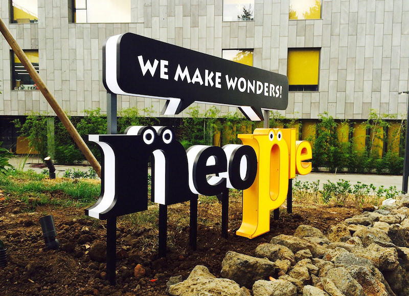基于Neople公司的精神,Jade Son將標(biāo)語(yǔ)”We make wonders ”用對(duì)話框的形式融入logo中,logo中加入了兩小眼睛,看起來就像是兩個(gè)小人說出標(biāo)語(yǔ)的感覺,充滿了奇趣感。采用鮮明的黃色和沉穩(wěn)的黑色,部分標(biāo)牌將icon和文字融合在一起,趣味性較強(qiáng)。將走廊設(shè)計(jì)成公路,讓人們體驗(yàn)到尋路的樂趣。