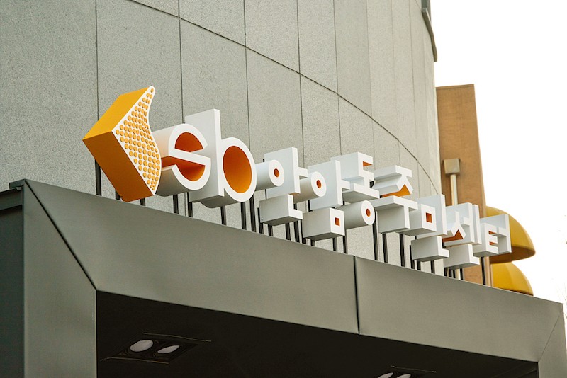 Everyday practice根據(jù)居民中心的裝修風(fēng)格,設(shè)計(jì)了簡(jiǎn)潔的導(dǎo)視系統(tǒng),字體設(shè)計(jì)較為現(xiàn)代化,使用無襯線字體,信息易于辨識(shí)。使用橙黃色作為主色調(diào),使辦公氛圍活潑,突出指示信息。在大門入口旁配備了立式信息導(dǎo)視牌,用作公告欄和地圖指示。