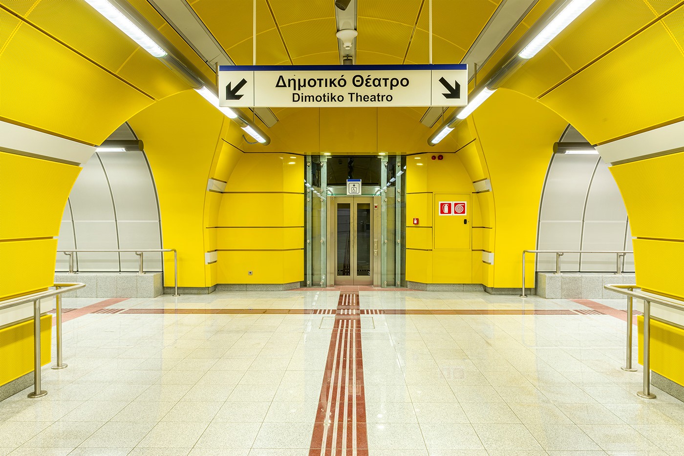 地鐵站的內(nèi)飾是明黃色和藍(lán)色的配色,呈現(xiàn)了清爽的工業(yè)風(fēng),Pygmalion Karatzass采用黑色、白色、灰色和藍(lán)色配色,與空間形成對(duì)比,使信息易于識(shí)別。信息多采用懸掛式標(biāo)牌,或被置于藍(lán)色拱門上,與環(huán)境相融合。使用電子屏幕展示歷史文化信息,打造了具有地方特色的地鐵空間。