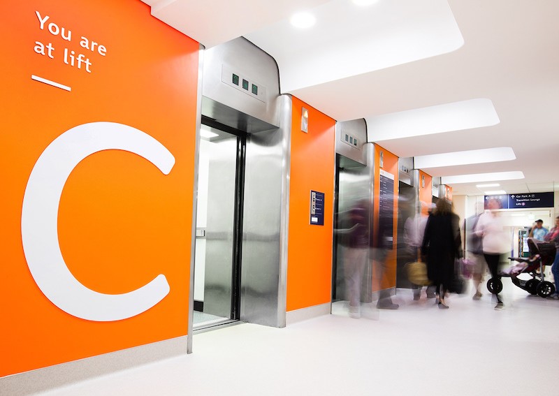 奧克蘭地區(qū)衛(wèi)生局有三個(gè)主要設(shè)施:奧克蘭市醫(yī)院、星艦兒童醫(yī)院和格林蘭臨床中心,Reid Douglas、Eden Short和Lauren Stewart對(duì)設(shè)施開展了人流量統(tǒng)計(jì),在人流量大的電梯口設(shè)置了大型的標(biāo)識(shí)用來提醒人們。使用黃色鮮明的具有活力的配色,使導(dǎo)視系統(tǒng)變得明確,減輕人們對(duì)陌生環(huán)境的壓力和焦慮,簡明扼要的信息標(biāo)識(shí)有助于人們尋路,提高了服務(wù)的效率和有效性。