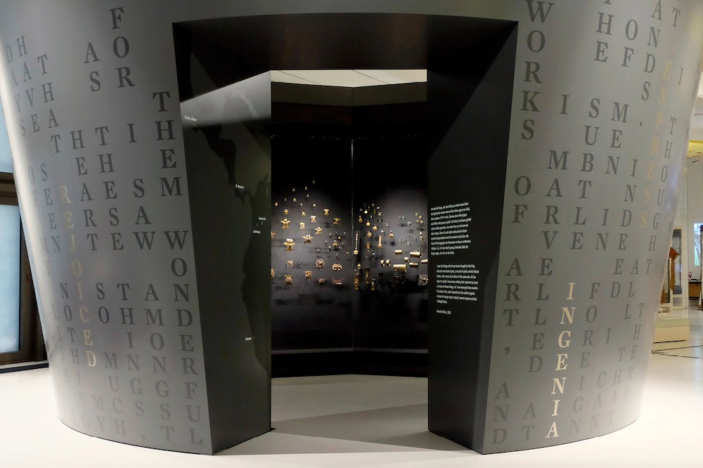 洪堡論壇博物館項目共三層、由60多個展廳構(gòu)成,gourdin工作室采用藍色、黃色、白色和黑色的配色,針對展區(qū)采用色彩作為底色進行區(qū)分,將展區(qū)進行模塊化處理。襯線字體搭配無襯線字體,有助于內(nèi)容層級劃分。在巨大的展廳設(shè)計了28×11 米的大洋洲地圖,整套導視系統(tǒng)具有高水平的結(jié)構(gòu)化設(shè)計。