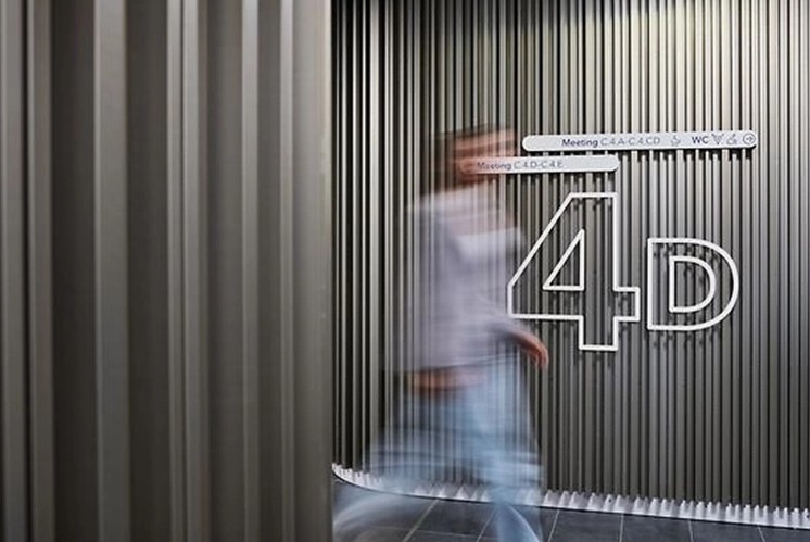 if團隊受委托為這一建筑群設(shè)計導(dǎo)視系統(tǒng),他們的設(shè)計理念深深植根于建筑本身的語言之中。建筑立面上那些動感十足的曲線和網(wǎng)格,塑造了森肯堡區(qū)的視覺形象,也成為了if團隊設(shè)計導(dǎo)視系統(tǒng)時的靈感來源。巧妙將這些建筑元素轉(zhuǎn)化為導(dǎo)視系統(tǒng)中的設(shè)計語言,通過垂直的板條和水平的線條網(wǎng)格系統(tǒng),構(gòu)建了一個清晰而富有節(jié)奏感的導(dǎo)航環(huán)境。