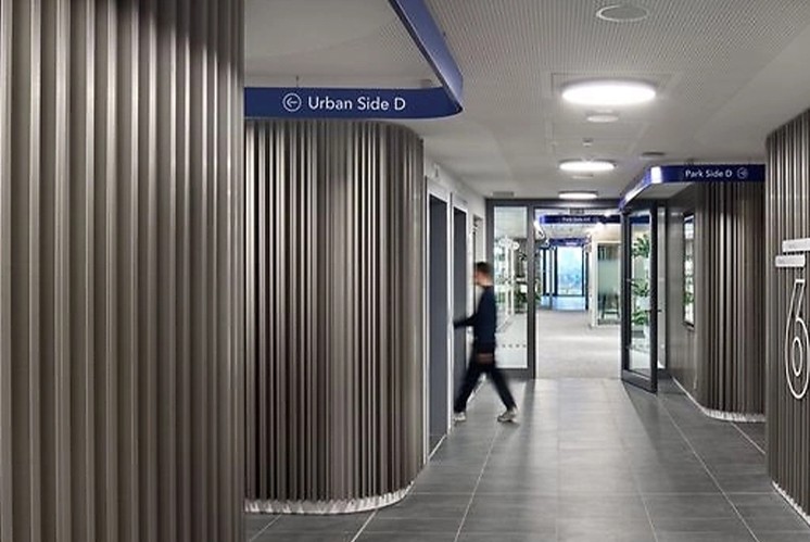 樓層的編號遵循了經(jīng)典的數(shù)字系統(tǒng)。在設(shè)計中,if團隊巧妙地運用了“藍(lán)絲帶”這一元素,優(yōu)雅地貫穿整個園區(qū),沿著走道延伸,如同一條流動的線索,引導(dǎo)訪客和員工穿梭于各個建筑之間。設(shè)計不僅增強了空間的導(dǎo)向性,還賦予了園區(qū)一種輕盈而現(xiàn)代的氛圍。