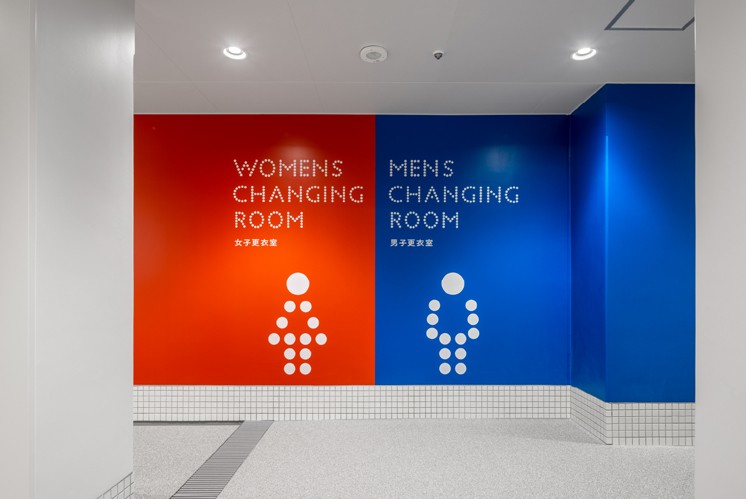 設(shè)計(jì)深諳色彩傳遞情緒與信息的力量。如男女更衣室標(biāo)識,鮮明的紅色與藍(lán)色形成強(qiáng)烈視覺對比,快速區(qū)分功能區(qū)域,契合運(yùn)動場所高效、直接的空間使用需求。黑色標(biāo)識在建筑灰色、場地淺色調(diào)背景下,憑借沉穩(wěn)厚重的視覺感,成為信息承載的可靠載體,既保證可讀性,又與運(yùn)動空間的現(xiàn)代感相呼應(yīng) 。