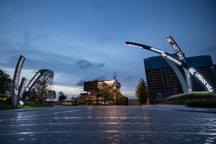 裝置所處的開闊廣場與背景建筑、天空共同營造出宏大的空間語境。黃昏時分,藍調的天空為裝置鍍上冷冽而富有未來感的底色,金屬環(huán)帶的光澤與地面磚石紋理的延伸感相互呼應,仿佛城市的肌理自然生長出這件藝術作品。觀者既能感受到 16.5 米高度帶來的視覺震撼,體會大型公共藝術的宏偉張力;又能湊近觀察環(huán)帶上的文字與形態(tài)細節(jié),捕捉人文、生態(tài)等細膩維度的表達,這種宏觀體量與微觀細節(jié)的融合,讓觀感體驗兼具震撼力與細膩度。