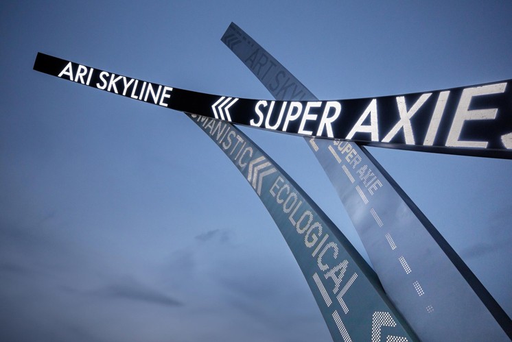 《三超環(huán)之門》作為第 58 屆日本標志設計協(xié)會獎入選作品,以獨特的形態(tài)構建與觀感營造,成為兼具精神象征與公共互動性的精神堡壘典范。它以 三種數(shù)據(jù)流形成三個環(huán)形環(huán)路為核心創(chuàng)意,16.5 米的高度與 33 米的直徑跨度塑造出宏大的裝置體量,整體向新城方向傾斜的姿態(tài),打破了靜態(tài)造型的桎梏,仿佛是城市發(fā)展勢能的視覺化呈現(xiàn),從形態(tài)根源處就傳遞出 流動連接的核心主題,讓 環(huán)不僅是幾何形態(tài),更成為承載城市脈絡的載體。