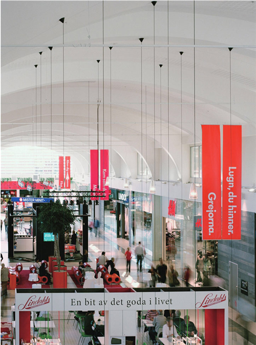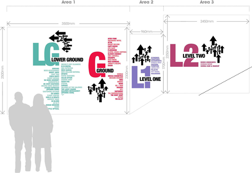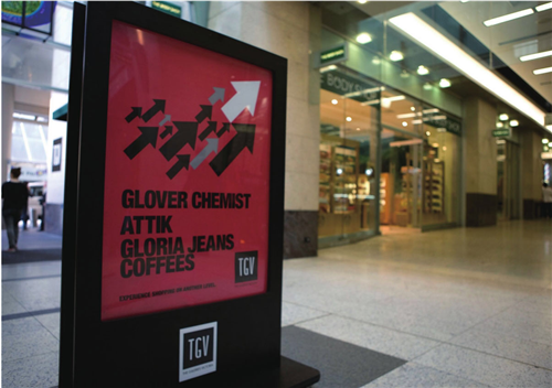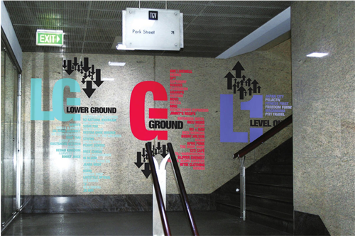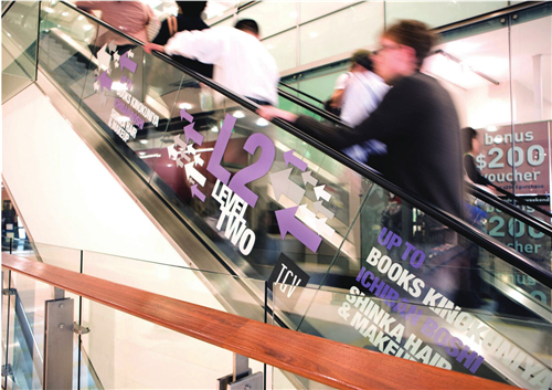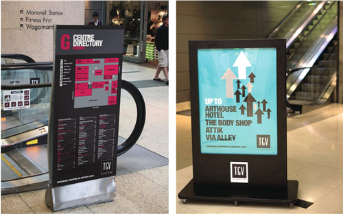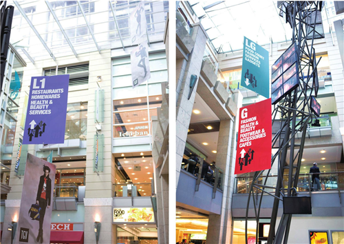 Galeries的導(dǎo)視系統(tǒng)設(shè)計(jì)有兩個(gè)目的:一是基本的導(dǎo)視系統(tǒng)功能,起到指引顧客行走方向的目的,不至于讓人們?cè)谫?gòu)物的過(guò)程中迷路;二是讓人們感受到一定的商業(yè)氛圍。