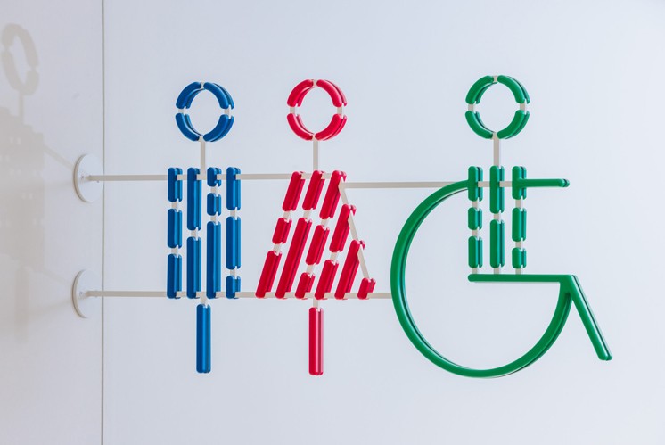 以衛(wèi)生間標(biāo)識(shí)為例,其形態(tài)采用模塊化的線條組合,塑造出男性、女性與殘障人士的形象,造型簡(jiǎn)潔現(xiàn)代卻充滿巧思。鮮明的色彩對(duì)比與規(guī)整的線條排列,既確保了功能識(shí)別的清晰性 —— 使用者能瞬間分辨不同區(qū)域,又因造型的活潑感傳遞出友好氛圍,讓導(dǎo)視不再只是冰冷的指示工具,更成為體現(xiàn)場(chǎng)所關(guān)懷的視覺符號(hào),提升了使用者與標(biāo)識(shí)互動(dòng)時(shí)的舒適觀感。