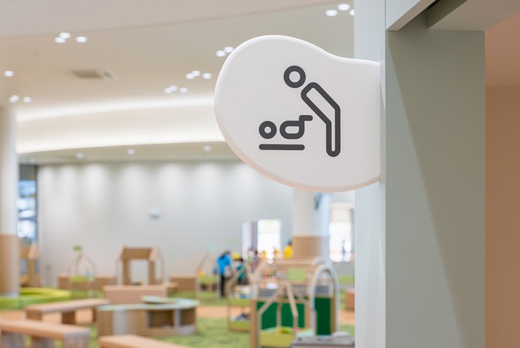 形狀設(shè)計(jì)是標(biāo)識(shí)系統(tǒng)的核心亮點(diǎn),蠶繭的有機(jī)形態(tài)被貫穿始終。從入口處的導(dǎo)視牌到各功能區(qū)的標(biāo)識(shí),都采用了圓潤(rùn)流暢的繭形輪廓,打破了傳統(tǒng)標(biāo)識(shí)常見(jiàn)的生硬幾何形態(tài)。例如導(dǎo)視牌的不規(guī)則橢圓、母嬰室標(biāo)識(shí)的柔滑曲線,乃至衛(wèi)生間標(biāo)識(shí)的繭狀造型,都呼應(yīng)著建筑外觀的繭形特色,讓標(biāo)識(shí)與空間形成渾然一體的視覺(jué)語(yǔ)言。這種充滿自然感的形態(tài),不僅契合兒童對(duì) “柔軟、可愛(ài)” 事物的感知偏好,也讓整個(gè)設(shè)施的空間語(yǔ)言更具連貫性,仿佛一個(gè)個(gè)蠶繭在建筑中自然生長(zhǎng)、指引方向。