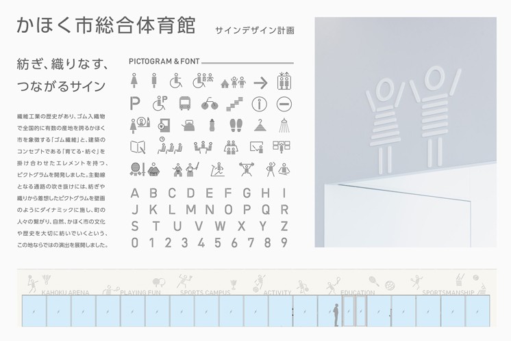 該綜合體育館標識系統(tǒng)設計,作為 2024 年日本 SDA 設計獎入選作品,以城市紡織工業(yè)歷史與建筑 “培育?編織” 的理念為核心靈感,打造出兼具功能與文化內(nèi)涵的視覺符號系統(tǒng)。該市橡膠混紡織物產(chǎn)業(yè)的獨特背景,與體育館 “聯(lián)結(jié)市民、自然與文化” 的訴求相碰撞,催生出這套既具地域辨識度又富人文溫度的標識體系。
