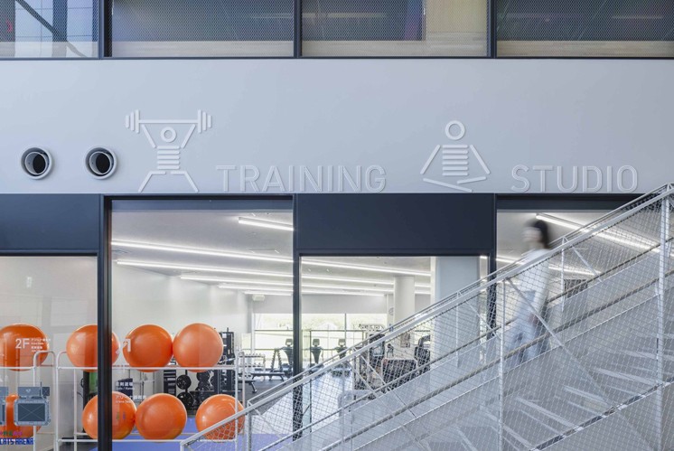 從觀感體驗而言,標識系統(tǒng)在空間中的呈現(xiàn)營造出連貫且富有層次的視覺敘事。主通道挑空區(qū)域的壁畫式動態(tài)呈現(xiàn),讓源自紡紗與織造的象形符號仿佛擁有流動的生命,為空間注入動態(tài)活力;而訓練室、柔劍道場、studio 等不同功能區(qū)的標識,既遵循整體設計語言保持統(tǒng)一感,又通過符號形態(tài)的細微變化區(qū)分場景,使市民在使用場館時,既能感受到視覺引導的清晰性,又能體會到文化浸潤的細膩感,增強了空間與使用者之間的情感聯(lián)結(jié)。