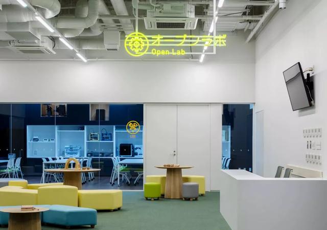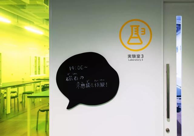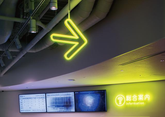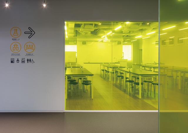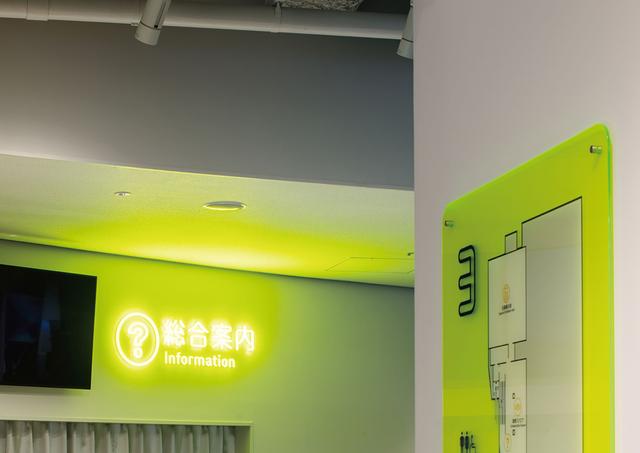利用標識引導,對于不會日語的訪客也很友好。玻璃也使用了熒光黃色。