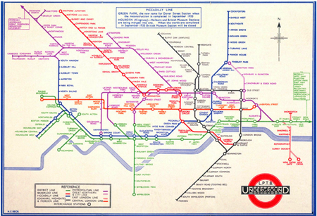 1933年,英國設(shè)計師哈里貝克對英國倫敦地鐵交通體系圖進(jìn)行了設(shè)計,簡明扼要、色彩鮮明的鐵路路線,圓圈標(biāo)明路線交叉點,重視線路走向、交叉和線路的區(qū)分。這個地圖設(shè)計具有非常高的視覺傳達(dá)功能性,從此這個設(shè)計也奠定了全世界交通圖的設(shè)計基礎(chǔ)。