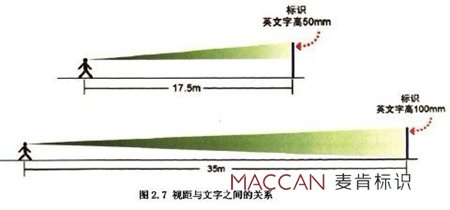 人體工程學(xué)測定人的頭部轉(zhuǎn)動最大的范圍是左右55度,輕松自如轉(zhuǎn)動的角度為左右45度,人的頭不發(fā)生轉(zhuǎn)動的情況下,依靠眼球轉(zhuǎn)動,單眼水平視野界限為166度,雙眼視區(qū)為124度,顏色的辨別水平視區(qū)為左右60度,文字識別為左右30度之內(nèi),垂直面內(nèi)視野界限在向上50度,向下70度的范圍之內(nèi),顏色辨別界限為向上30度,向下40度,最佳眼睛轉(zhuǎn)動區(qū)為向上25度,向下30度,站立時的自然視線為向下10度,坐著時的自然視線為向下15度。另外,根據(jù)下圖我們可以了解到視覺認(rèn)知的距離。 控制標(biāo)牌的高度、視距、間距以及字體大小等,其中遠(yuǎn)視距為25到30米, 中視距為4到5米,近視距為1到2米:懸掛高度為2到2.5米:中英文字體的大小比例為3:1;字體以標(biāo)準(zhǔn)中文黑體字為主,連續(xù)設(shè)置的間距為50米,當(dāng)遇到距離在30到50米問需要設(shè)置標(biāo)牌的情況時,則采用貼附式倒是標(biāo)識用以補充。